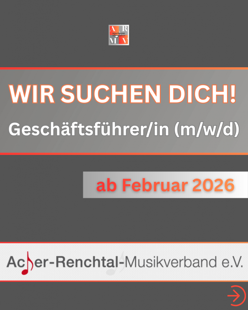 Wir suchen ab Februar 2026 eine/n neue/n Geschäftsführer/in für den Acher-Renchtal-Musikverband. Der ARMV repräsentiert 38 Musikvereine in der nördlichen Ortenau und ist das Bindeglied zwischen dem Bund Deutscher Blasmusikverbände (BDB) mit der BDB-Musikakademie in Staufen und unseren Migliedsvereinen und organisiert unter anderem die Aus- und Fortbildung unserer Musiker/innen in allen Altersbereichen. Das Präsidium des Acher-Renchtal-Musikverbandes